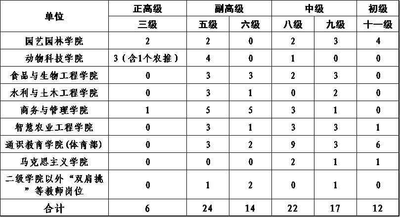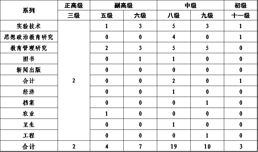 正高二级教师系列和辅系列岗位指标计划总数为1个,其他级别空余岗位指标数见下表: