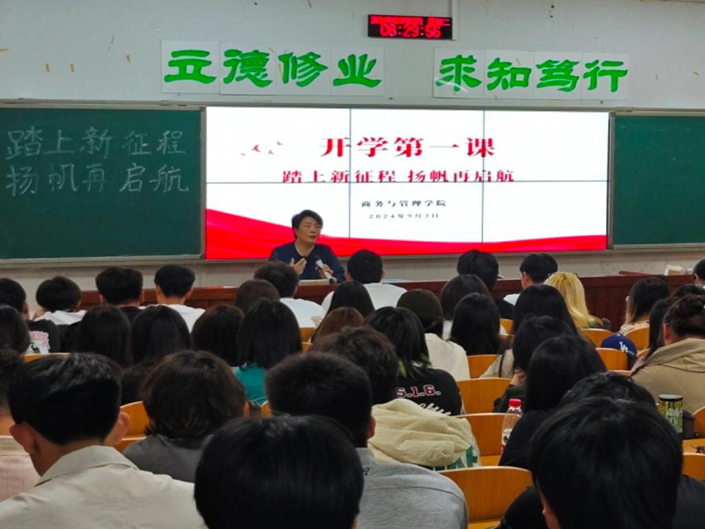 商务与管理学院党总支书记王新华以“踏上新征程,杨帆再启航”为题,为同学们讲授“开学第一课”。她对同学们提出四点希望:一是胸怀爱国之心,坚定理想信念;二是学农知农爱农,服务乡村振兴三是勤奋刻苦学习,练就真才实学;四是树立底线思维严守制度规矩。并祝愿同学们拥有温暖、充实而又难忘的大学时光。