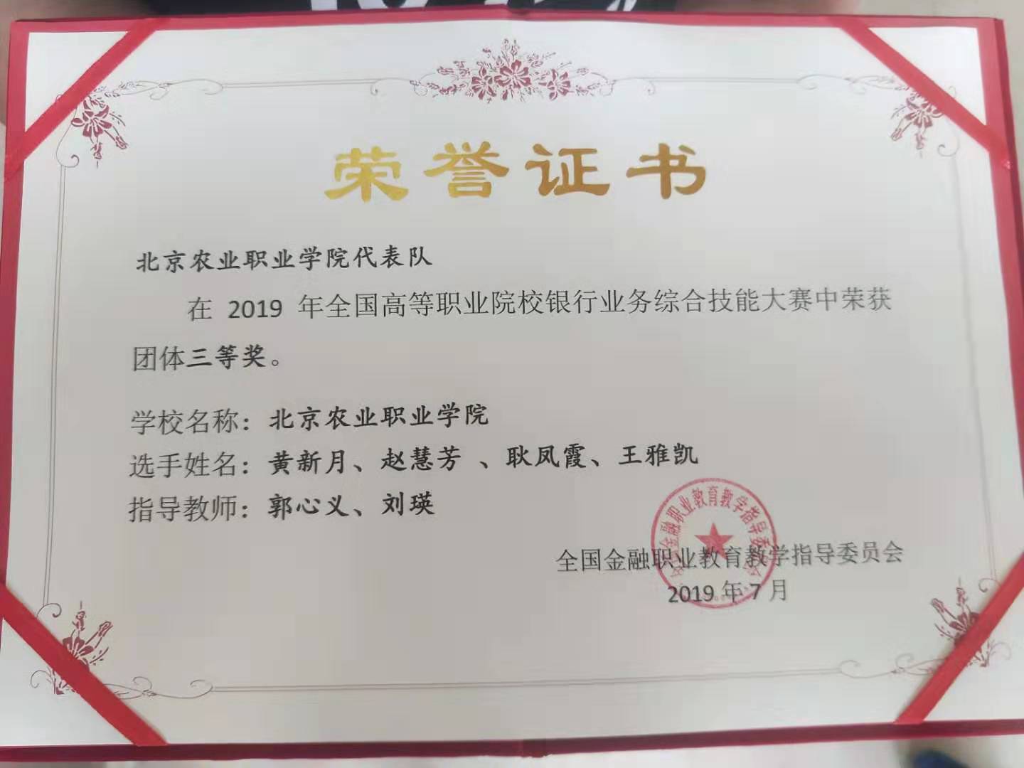 7月4日,全国高等职业院校银行业务综合技能大赛在山东外贸职业学院圆满落幕,来自全国111所高职院校,111支代表队,共444名学生参加了此次比赛。经过激烈角逐,由我系金融管理专业2017级的黄新月等4名同学组成的代表队荣获大赛团体三等奖,取得了我院学生参加此项赛事以来的最好成绩。