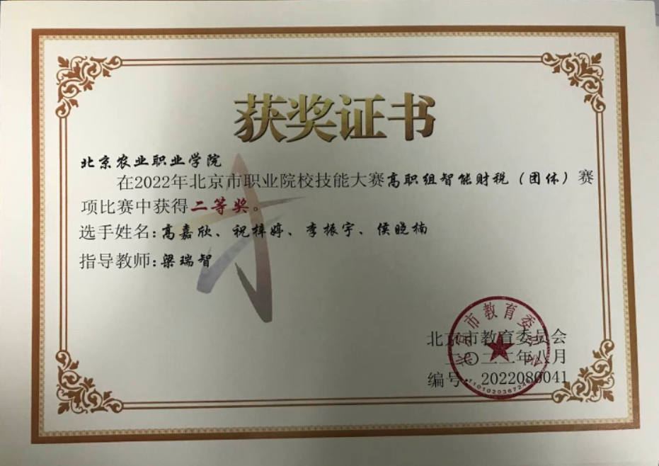 我系高嘉欣、李振宇、侯晓楠、祝梓婷四名同学在2022年北京市职业院校技能大赛高职组智能财税(团体)赛项比赛中获得“二等奖”。