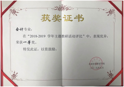 会计专业积极探索教育教学改革,完善教师之间合作、交流、共探、共享的教学研究机制,已取得一定成效,在学院首次举办的年度主题教研活动评比中荣获一等奖。