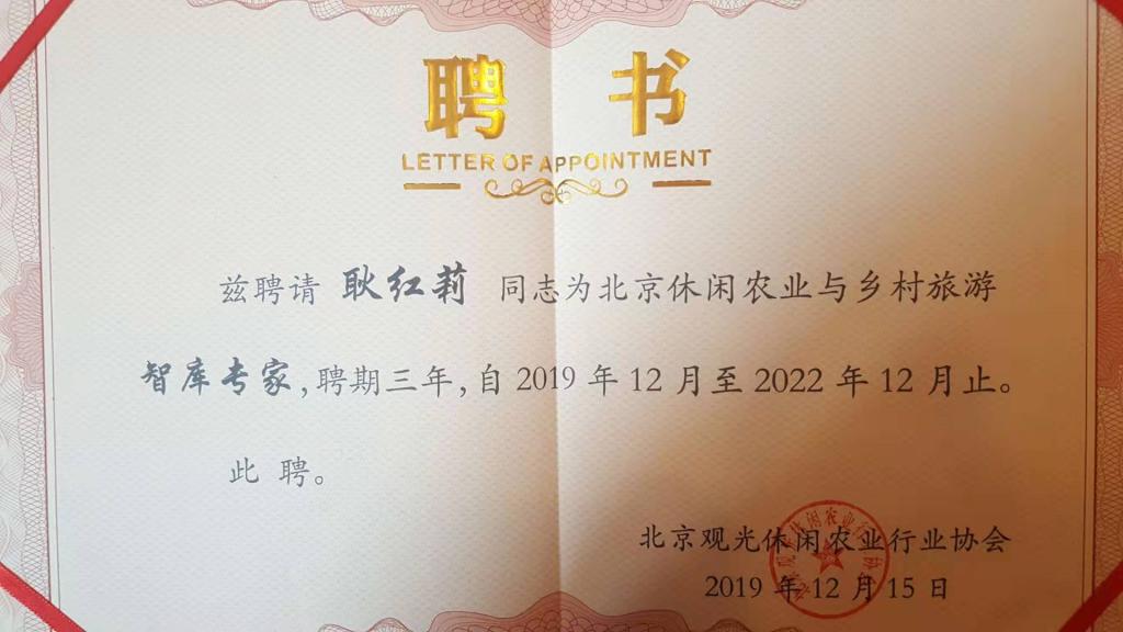 2019年12月15日,2019京郊冬季乡村休闲项目推介暨北京观光休闲农业行业协会成立十五周年年会在北京顺义区意大利农场举行。会上,北京观光休闲农业行业协会聘请我院现代服务管理系旅游管理专业耿红莉副教授为北京休闲农业与乡村旅游智库专家并授予聘书。