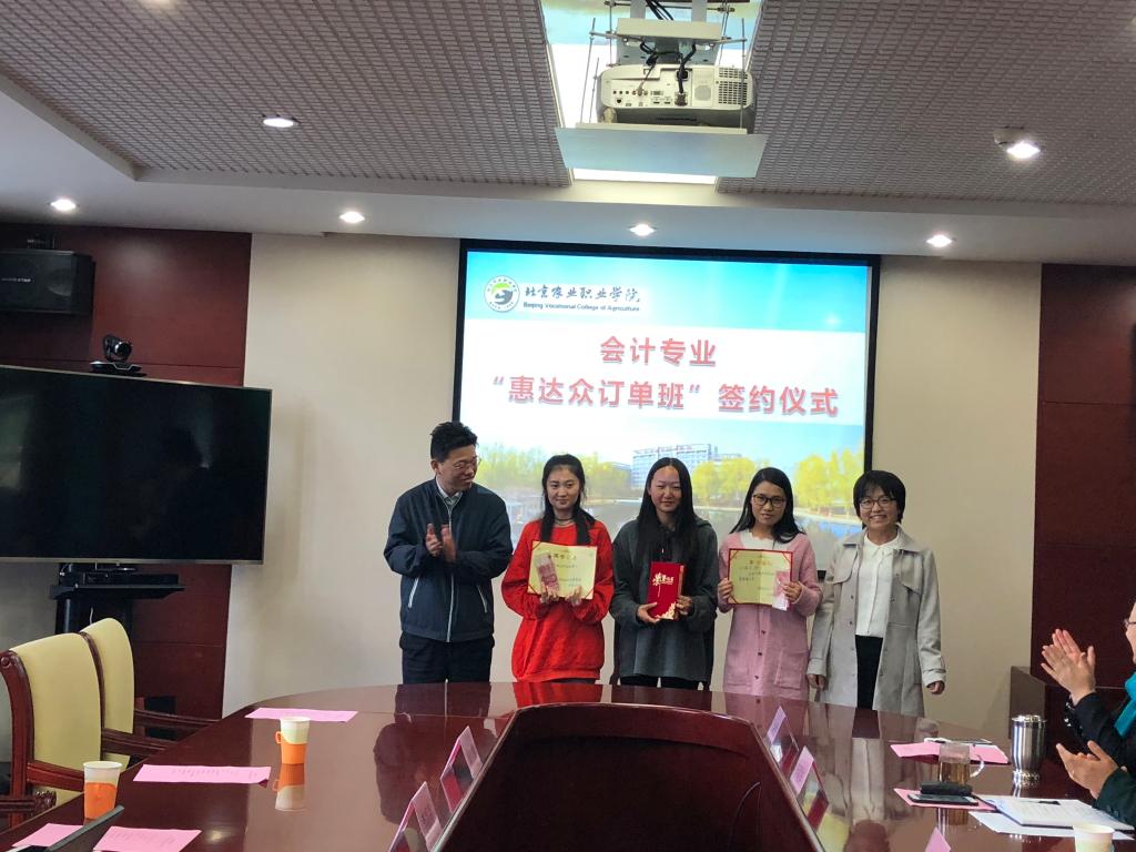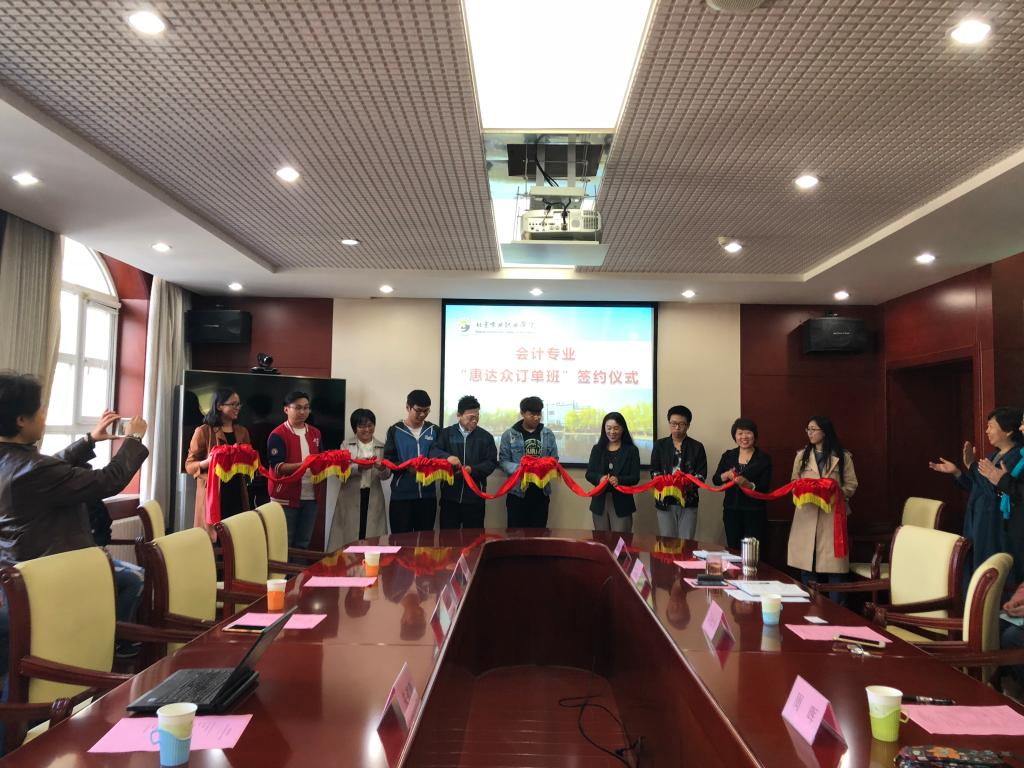 财会金融系李艳芳主任主持了此次签约剪彩活动。签约仪式上,北京惠达众会计师事务合伙人李晶晶和财会金融系李艳芳主任分别代表双方共同签订了“订单班”联合培养协议书。校企双方领导共同参与了剪彩仪式将活动推向了高潮。订单班的签约成立,是校企双方发挥各自资源优势、采取灵活多样的培养方式,联合培养会计专业人才的新举措,能够实现企业人才需求和学校人才供给的无缝对接,对促进我院会计人才培养模式的改革与创新具有重要意义。