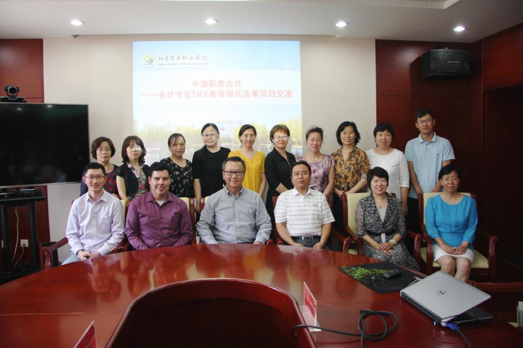 6月20日,澳大利亚职业教育联盟(Australia Vocational Education Alliance,简称AVEA)秘书长关北松先生、澳大利亚墨尔本理工学院TAFE会计培训专家David Medina博士一行至我院北校区进行“中澳职业教育合作TAFE教育模式改革项目”的调研和交流。学院教务处杨永杰处长、张红副处长,国际合作与交流处梁秀文处长,财会金融系李艳芳主任、敬燕萍书记、周晖副主任以及会计专业全体教师、教务处教学保障科负责人参加了此次活动。