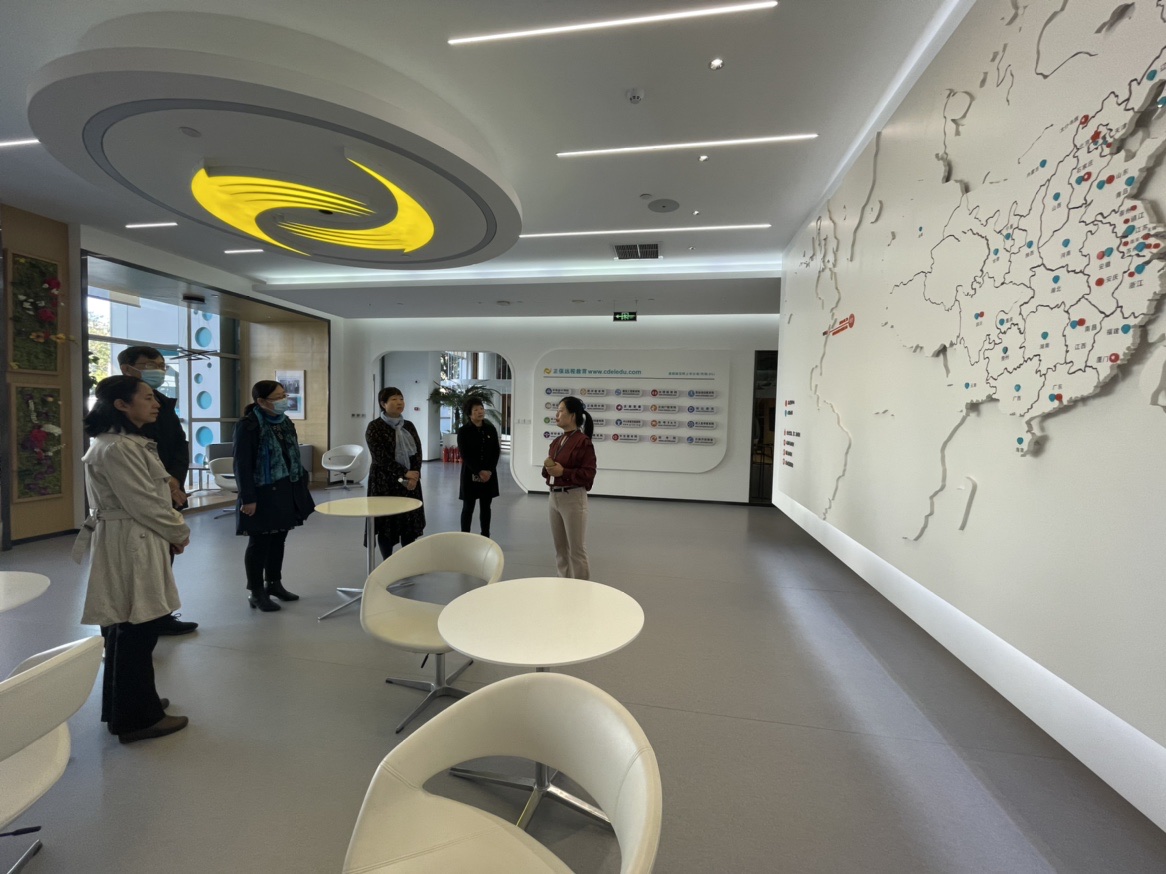 调研团队一行在徐建宁副总裁的陪同下,参观了教学研发中心、演播中心、网络技术等部门,进一步感受正保企业文化,现场体验了直播间和智能双屏录课室,详细了解了正保及网中网在线课程的录课设备、工作流程。
