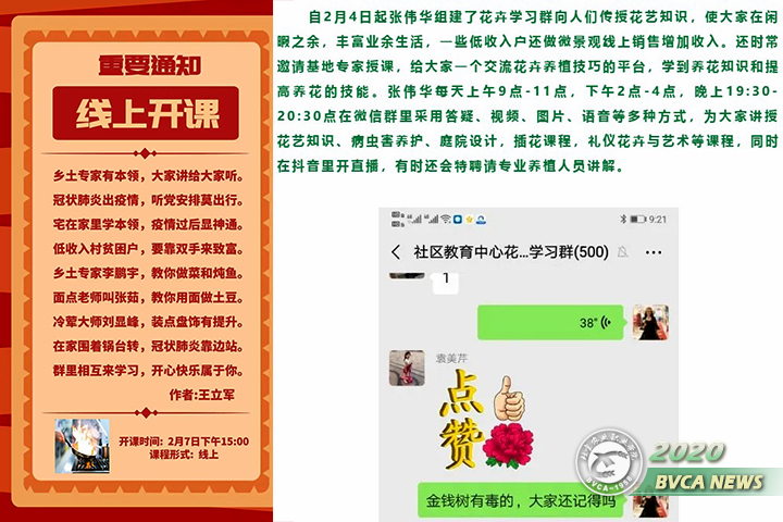从2月6日至今,共举办了烹饪、蔬菜种植、花卉管理、芽苗菜种植、手工制作、食用菌种植等网上课程,最小群人数200多人,最大的群500多人。初步统计,疫情期间参与培训学习交流群40个以上,参加培训学习人数15000人以上。