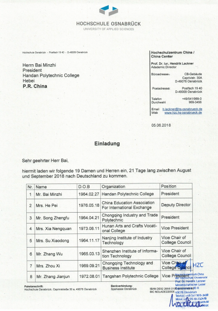 2.配合落实《高等职业教育创新发展行动计划(2016-2018年》,开展双边职教院校管理者的深入交流,从而促进我院与德国职教院校间的务实合作。