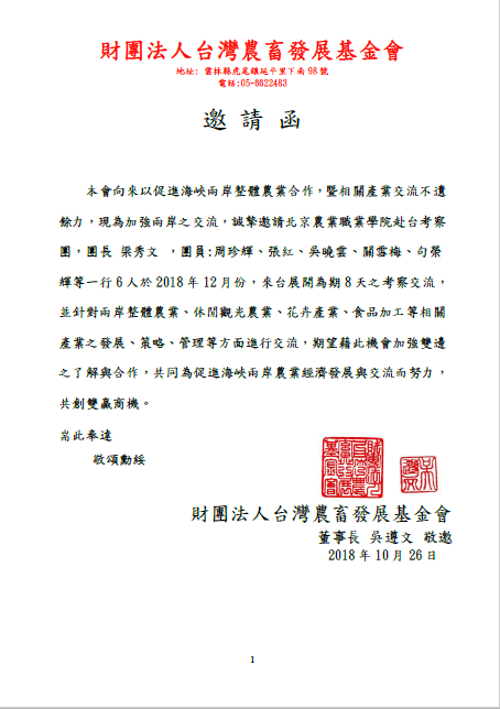 邀请单位介绍:台湾农畜发展基金会是一家在台湾有影响的农业团体,其宗旨为协助台湾地区农业、畜牧事业发展,推展有机农业及认证,农业(含渔牧林)水质、土壤、药品、原物料及产品验证、农产品产销、改善投资环境产业结构、污染防治、疾病防治、防疫、安全卫生与致力有关专业训练、专门知识报导及协助农畜产业应对加入WTO的冲击,促进产业平稳发展。近年来,基金会积极筹划农特产品的网络营销工作,盼借由网络营销能有效调节产销功能,提升农渔民的产值与经济效益,落实照顾农渔民让农渔业平稳发展,使基金会为农渔民所信赖与依靠,并作为政府与农渔民沟通的桥梁共创三赢,并积极与大陆相关农、渔、牧业团体、产业、各省市农业厅、农业局等互动频繁,对两岸农业交流与发展有相当大的贡献。