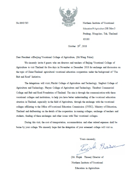 我院应泰国北部农业职业教育中心邀请,拟于2018年12月3日-7日派出团组赴泰国进行中泰职业教育合作访问,在外停留时间5天。相关信息公示如下: