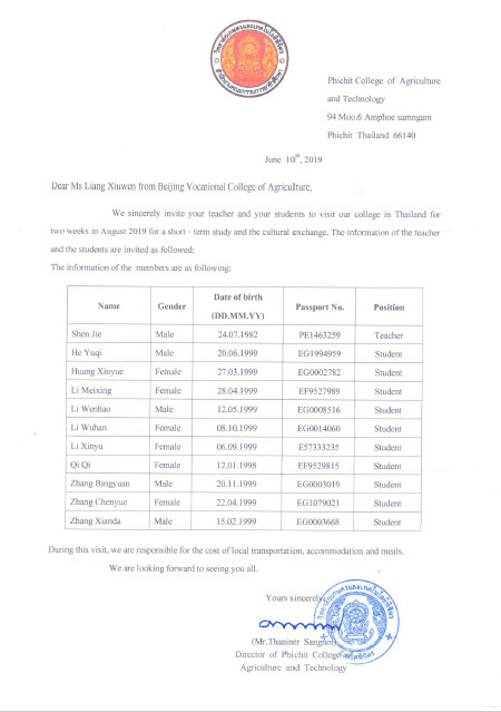 我院应披集农业技术学院邀请,拟于2019年8月18日-8月31日派出1名教师带10名学生团组赴泰国进行泰语、泰国文化和农业专业体验活动,在外停留时间14天。