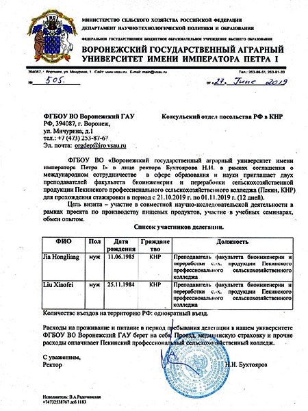 我院应俄罗斯沃罗涅日国立农业大学邀请,拟于2019年10月21日-11月1日派出2名教师赴该院进行科研交流,在外停留时间12天。
