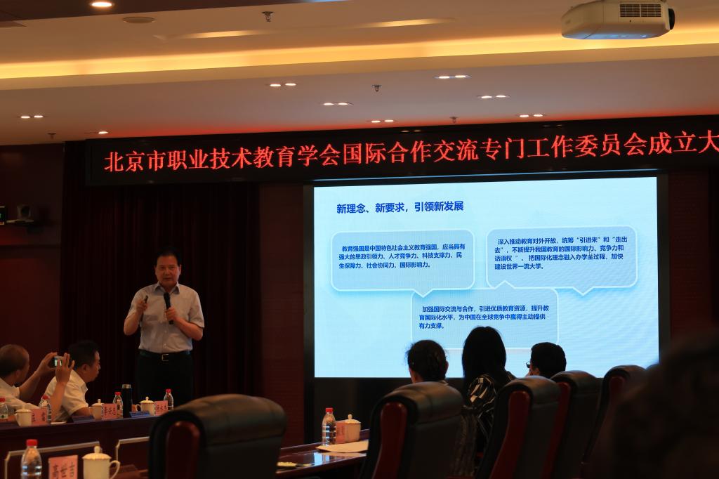 李师在讲话中强调,国际专委会的成立,是北京市职业技术教育学会发展壮大的里程碑,也是市教委落实《北京市贯彻教育强国建设规划纲要实施方案》又一新的举措,是北京职业教育国际化进程中的一件大事。希望专委会在北京市职业技术教育学会领导下,聚力致远,成为推动北京职业教育与国际接轨的“桥梁”和“引擎”。