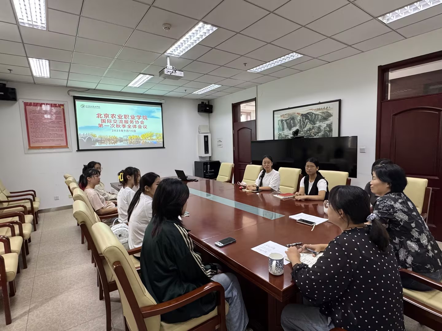 会议首先回顾了上半年工作情况。25年春季学期,协会成员共参与校级国际交流活动3场,协助接待外宾数十人,参与北京职业技术教育学会国际合作交流专门工作委员会成立大会的会务工作,为学校国际交流工作提供了有力支撑;组织4场实训基地英文讲解演练,协会成员英文应用水平得到有效提升。与会学生逐一分享了参加协会活动的收获与成长。