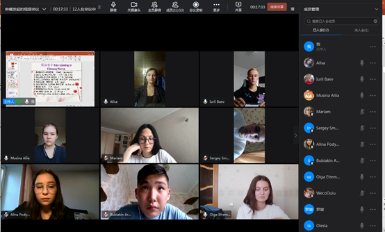 课上,留学生部申晴老师给学生观看了我院宣传视频,并结合学院对留学生管理的具体要求,对10名留学新生未来的学习进行了简要的介绍,按照学院总体教学计划安排,于2021年9月2日顺利开展(2021-2022第一学期)网上教学授课。全部留学生在各自国家参加网上学习,以每周一至周五不低于每天2学时的时间里完成规定的学习任务。而后留学生们又对各自的情况进行了简单的介绍,还表达了自己对即将开始的汉语学习的期盼之情。来自俄罗斯莫斯科的Olesia同学还用汉语进行了简单的自我介绍。