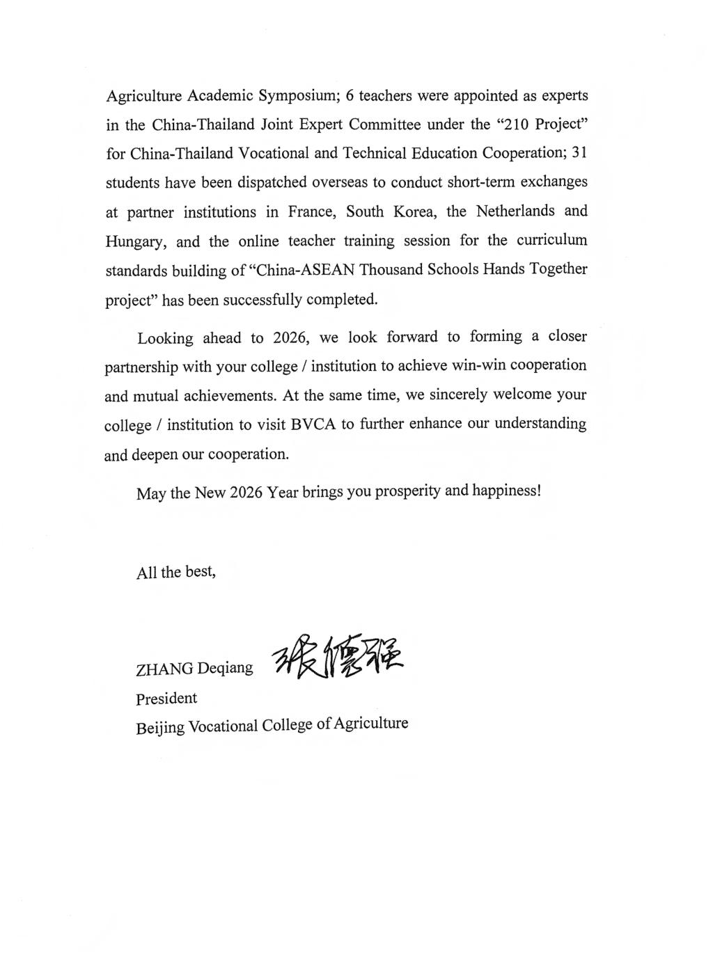 A Letter of Gratitude and Future Outlook from President Zhang Deqiang to International Cooperation Partners