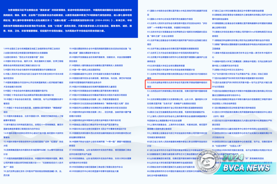 近期,中国民间组织国际交流促进会(简称“中促会”)发布了第七届中非民间论坛、第七届中非青年领导人论坛成果文件《“丝路⼼相通”―中非民间友好伙伴计划(2024-2026)》,学校与北京农学会、毛里求斯福尔肯联盟合作申报的《“一带一路”及非洲农业国家合作的北农方案》被纳入中非民间友好伙伴计划。