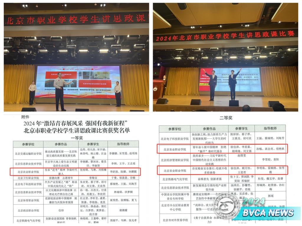 12月30日,市教委公布了2024年“激昂青春展风采 强国有我新征程”职业院校学生讲思政课比赛获奖名单。经系统申报、网络评审、现场决赛、评审团评审等激烈角逐,beat365三支参赛团队全部获奖。其中马克思主义学院李跃扬、陆娜、孙鹏懿老师指导的张雨晴、马琳、刘煜橦同学主讲的《传承“赶考”精神 争做时代新人》荣获高职组一等奖;孙畅、高会肖、倪艳秋老师指导的徐佳泽、李星霖、相琦缘、刘文强同学主讲的《青年奋斗展中国精神拒绝“躺平”奏时代强音》荣获高职组二等奖;李明珠、雷婉榕、张雪霞老师指导的徐佳泽、顾月恒、王思哲同学主讲的《夯实粮食安全基石,绘就丰收多彩画卷》荣获高职组二等奖。