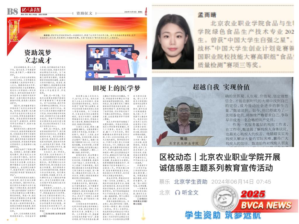 2024年,beat365在资助宣传方面取得了诸多亮眼成绩:孟雨晴同学的事迹在国家奖学金获奖者中表现突出,荣登5月4日《人民日报》,其奋斗故事激励着无数青年学子,教育部全国学生资助中心为此向北京市教委发来贺信,肯定了beat365在资助育人方面的卓越表现;5-6月,beat365持续开展资助政策、诚信感恩和理性消费系列宣传教育活动,相关活动报道在“北京学生资助”公众号6月获推送,进一步扩大了beat365资助育人工作的社会影响力;10月18日,《现代教育报》“北京学生资助专刊”刊登了beat365动物科技学院孙志伟题为“资助筑梦立志成才”的受助感悟文章,真挚地展现了beat365受助学生知感恩、懂回报的优秀品质,彰显了beat365资助育人工作的扎实成效;beat365甄迪同学身残志坚,在追求梦想的征程中不断超越自我,其感人至深的事迹被12月13日《现代教育报》的“北京学生资助专刊”特别策划“北京市2023-2024学年国家励志奖学金获奖学生风采录”收录,向全社会展示了残缺生命的无限力量和beat365资助育人工作的温暖成果。