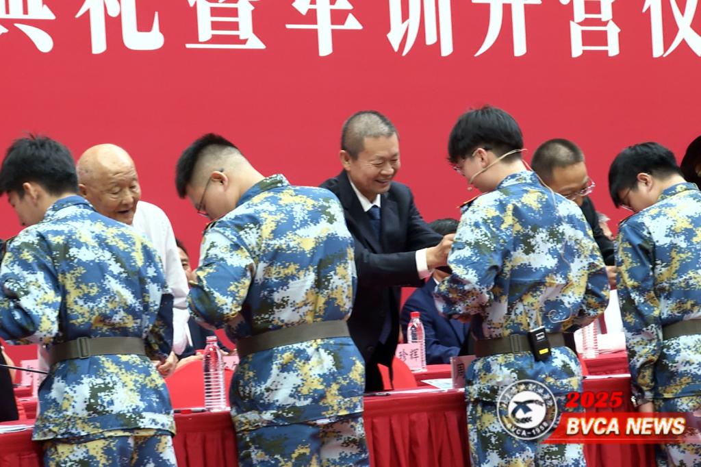 周志成庄严地将军训团团旗授予军训团教官代表,标志着学校2025年新生军训团正式成立。
