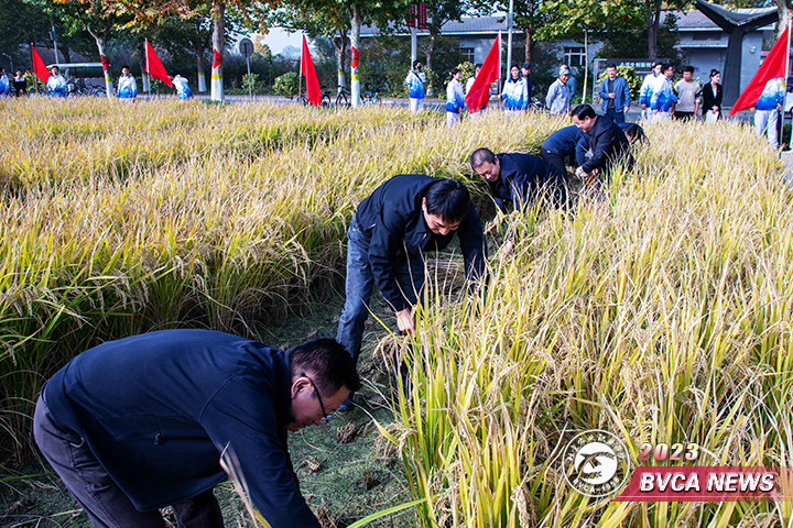 院领导为本次活动开镰。热热闹闹的稻田里,农事专家耐心指导,师生们挥镰收割、打捆垒垛,现场一副热火朝天的劳动场景,大家欢天喜地,热闹非凡。在师生共同努力下,金灿灿的稻田很快变成了成堆的谷垛,丰收活动在一片欢声笑语中圆满落幕。