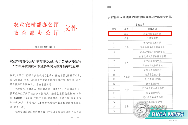 5月26日,农业农村部、教育部在江苏联合推介了百所乡村振兴人才培养优质校和农业科研院所。学院被评为全国乡村振兴人才培养优质校。此次入围的乡村振兴人才培养优质校,是按照“广泛推荐、优中选优、引领示范”的原则遴选,经院校自荐、省级推荐、专家评审等环节产生。全国共有101所高校(含科研院所)获选,包括16所高校、55所高职、27所中职、3所科研院所,学院是北京市唯一入选的高职院校。
