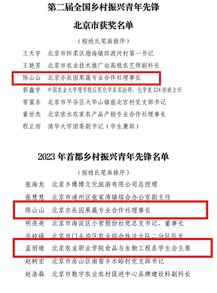 近日,共青团中央、农业农村部联合印发《关于表彰第二届全国乡村振兴青年先锋的决定》,我院现代服务管理系2022届校友陈山山荣获“第二届全国乡村振兴青年先锋”“2023年首都乡村振兴青年先锋”称号,食品与生物工程系绿检2111班孟雨晴同学荣获“2023年首都乡村振兴青年先锋”称号。