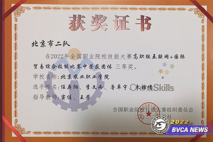 2022年8月下旬在陕西咸阳举办的2022年全国职业院校技能大赛高职组“互联网+国际贸易综合技能”赛项中,学院经济管理系2020级国贸专业任奥阳、李文雨、鲁卓宇和朱雅倩四位同学获得三等奖,成为北京代表队近两年来在该国赛项目中的唯一获奖队伍。
