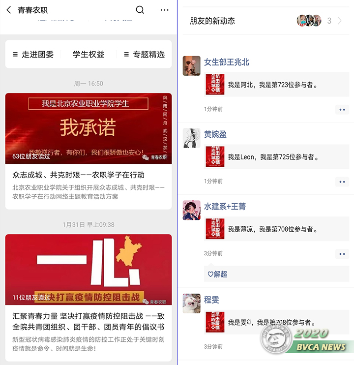 院团委通过“青春beat365”公众号、团支部书记群等平台,及时传达关于疫情防控最新动态,主动做好舆论引导工作。发布《汇聚青春力量,坚决打赢疫情防控阻击战——致全院共青团组织、团干部、团员青年的倡议书》,全力做好青年战“疫”动员工作。发起“beat365人,我承诺”线上承诺接力活动,全体团员通过线上接力的形式,承诺服从学院各项安排,切实做到不离家、不返校,做好自身防疫工作,珍惜“宅家时光”。承诺书得到学生的大量转发,发出次日访问量高达13334次,形成良好的动员、宣传局势。二