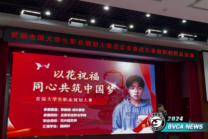 北京市赛总决赛共分为主题陈述、综合面试、天降offer三部分。魏琪轩同学以“以花祝福,同心共筑中国梦”为题,从职业目标、成长展示以及规划思考等方面展开职业生涯规划,立志成为一名优秀的花卉园艺师。他精彩的演讲获得了评委和观众的一致认可,最终斩获了市赛金奖。