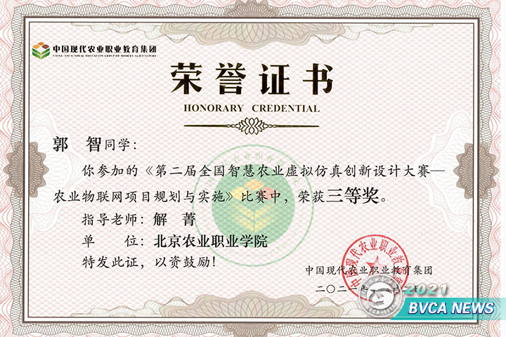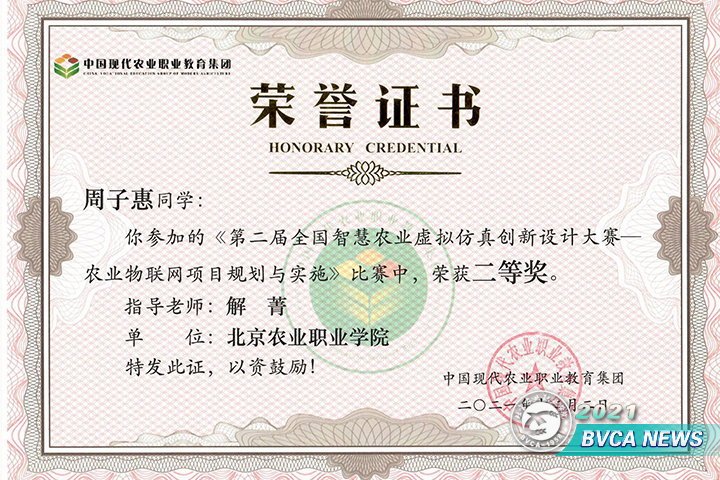 11月6日,由中国现代农业职业教育集团主办、江苏农林职业技术学院、中农产教(北京)科技有限公司和南京柯姆威科技有限公司承办的“2021年第二届全国智慧农业虚拟仿真创新设计大赛”如期举行,信息技术系赵博新荣获大赛一等奖,周子惠、郭智分获二等奖和三等奖,解菁老师荣获大赛优秀指导教师。