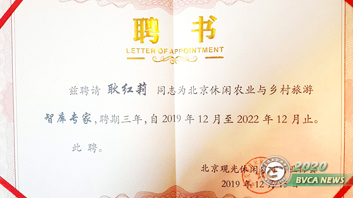 2019年12月15日,2019京郊冬季乡村休闲项目推介暨北京观光休闲农业行业协会成立十五周年年会在北京顺义区意大利农场举行。会上,我院现代服务管理系旅游管理专业耿红莉副教授受聘为北京休闲农业与乡村旅游智库专家并授予聘书。