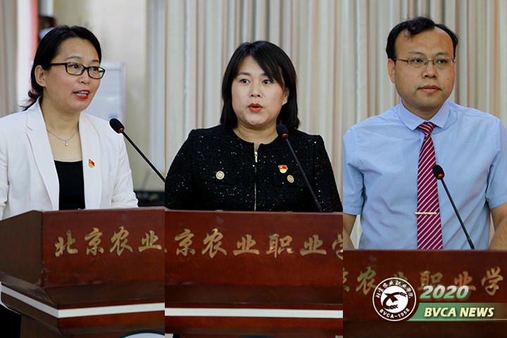 基础部(思政教研部、体育部)副主任兼思政教研部主任万俊丽、畜牧兽医系辅导员董冠英、园艺系园艺技术专业教师高照全等三位教师作为教师代表发言。万俊丽老师号召老师们要一如既往做有信仰的人,一如既往努力做好学生的引路人;董冠英老师分享了学生思想教育和日常管理的感悟;高照全老师通过自己依托专业技能开展扶贫攻坚,立足三尺讲台投身职教改革的经历与收获,呼吁老师们躬耕田亩,立足讲台,与祖国共命运,与学院共成长。