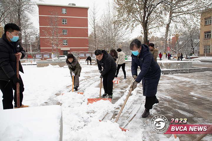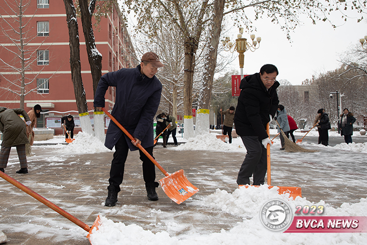 在学院领导的带领下,行政楼干部职工齐上阵,积极清理行政楼前广场和道路上的积雪。大家手持铁锹、扫帚等除雪工具,不畏严寒,干劲十足,热火朝天的劳动场面构成了一道亮丽的校园风景线。经过大家的共同努力,楼前道路很快实现了雪后的新生,积雪清扫活动圆满完成,确保了师生出行安全。