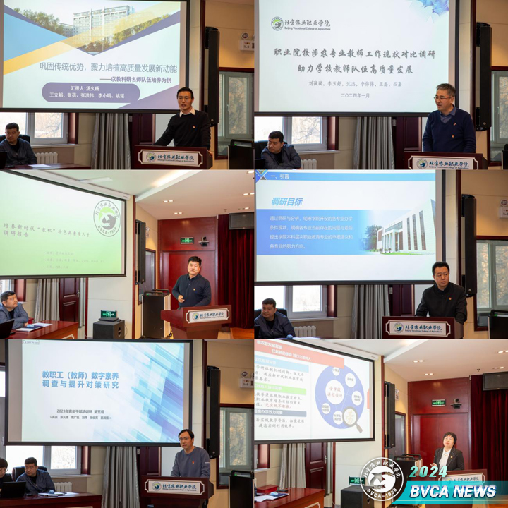 各小组分别从《巩固传统优势,聚力培植高质量发展新动能——以教科研名师队伍培养为例》《职业院校涉农专业教师工作现状对比调研,助力学校教师队伍高质量发展》《培养新时代“beat365”特色高素质人才》《本科层次职业教育专业申报可行性研究》《教职工(教师)数字素养调查与提升对策研究》《笃农强技--提升实践性教学实效调研》六个角度汇报了课题研究情况,分析了学校现状、制约高质量发展存在的问题及解决对策与建议。