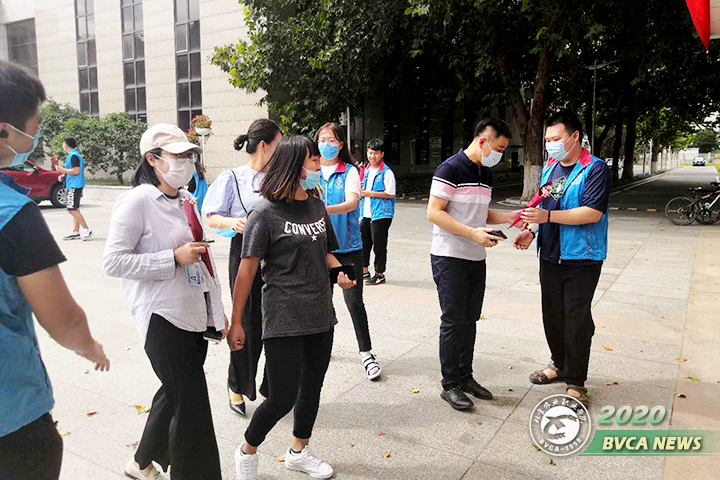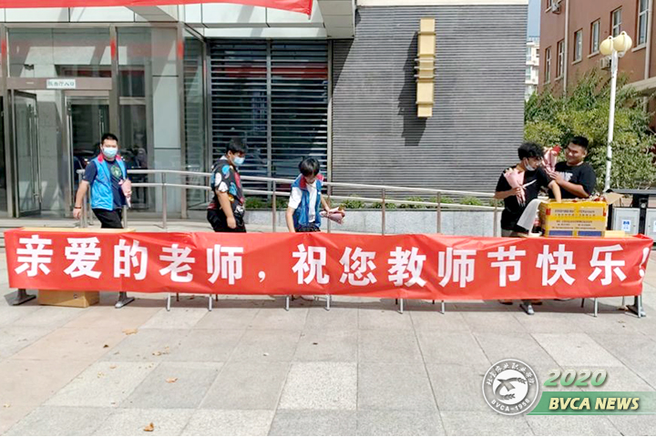9月10日,学生干部们提前在教工食堂门口布置了印有“半年未见,好想您,我亲爱的老师”“亲爱的老师,祝您教师节快乐”字样的条幅。15名学生干部在食堂门口列队,为来往的老师送上教师节祝福,并献上鲜花。