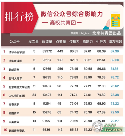 近日,在北京青年发布的北京团组织微信公众号排行榜中,院团委公众微信平台“青春beat365”与“清华小五爷”、“清华研读间”、“北邮青年”、“北科大青年”等重点院校团学公众号一同进入高校共青团系统微信公众号综合影响力榜单前十名。