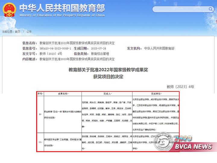 在《2023 中国职业教育质量年度报告》发布会上,学校获评“人才培养卓越校”(东部地区),“耕读传家育人新模式”案例入选报告文化传承部分案例;《弘扬耕读精神发挥beat365特色培育知农爱农人才》《善用“大思政”点“靓”新乡村》在北京市职业技术教育学会思政和德育工作优秀案例中分获一等奖、三等奖。
