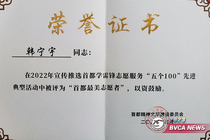 近日,我院畜牧兽医系学生韩宁宇在2022年宣传推选学雷锋志愿服务“五个100”先进典型活动中,被评为“首都最美志愿者”。