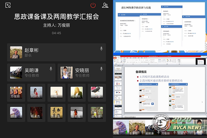 会上,思政课教师吴明谦、孙畅、刘倩、倪艳秋分别代表所在的课程教学组和校区教学组进行了工作汇报。老师们分别结合自身教学实践从信息平台学习、教学文件准备、教学资料搜集、教学方式探索、教学效果显现、教学总结反思等方面进行了总结汇报,展现了教师们针对线上教学从学习探索到熟练应用的整个过程,内容专业详实、风格求实稳健,得到了听课小组各位同志的高度认可。