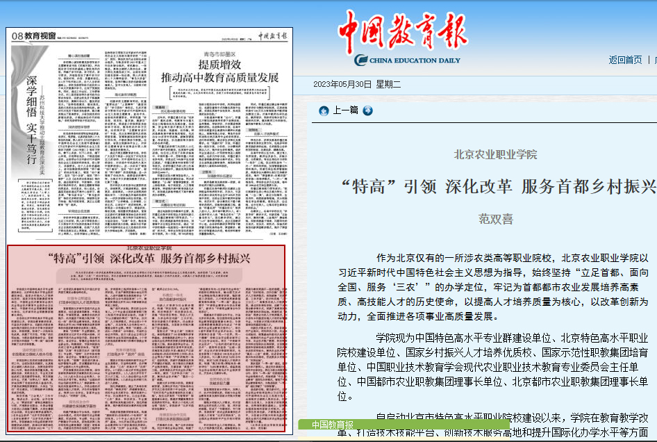 自启动北京市特色高水平职业院校建设以来,学院在教育教学改革、打造技术技能平台、创新技术服务高地和提升国际化办学水平等方面踔厉奋发、积极探索,取得了一大批标志性成果,积累了可示范、可推广的beat365经验,为服务国家粮食安全、首都乡村振兴和国家“一带一路”倡议等贡献了北京beat365智慧。