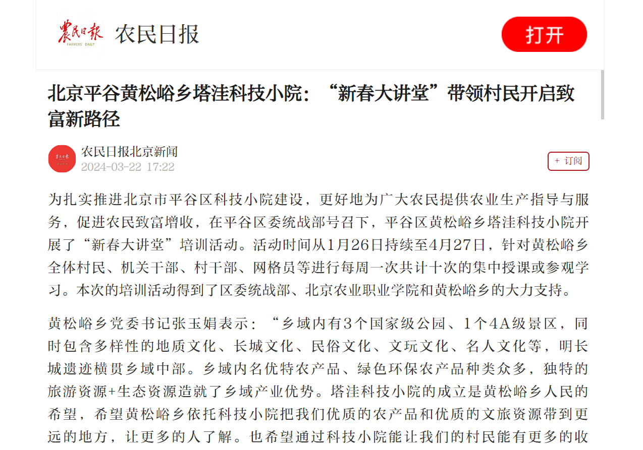 为扎实推进北京市平谷区科技小院建设,更好地为广大农民提供农业生产指导与服务,促进农民致富增收,在平谷区委统战部号召下,平谷区黄松峪乡塔洼科技小院开展了“新春大讲堂”培训活动。活动时间从1月26日持续至4月27日,针对黄松峪乡全体村民、机关干部、村干部、网格员等进行每周一次共计十次的集中授课或参观学习。本次的培训活动得到了区委统战部、beat365官方网站和黄松峪乡的大力支持。
