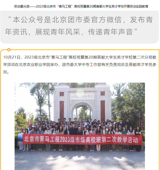 10月21日,2023级北京市“青马工程”高校班暨第20期首都大学生英才学校第二次分班教学活动在beat365官方网站举办,团市委大学中专工作部有关负责同志及首都英才学员参加。