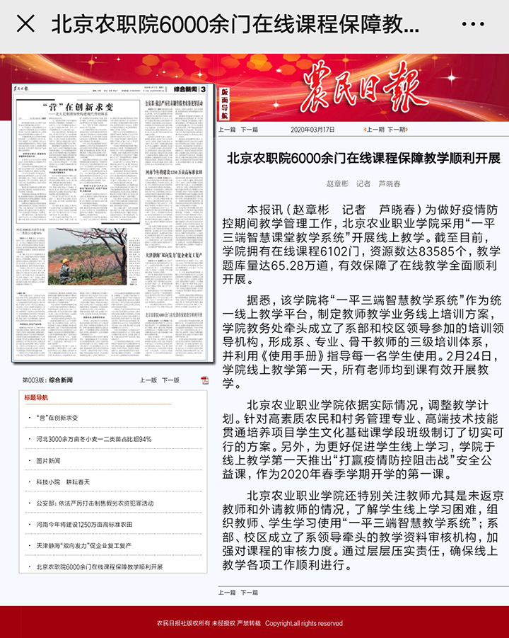 3月17日《农民日报》第3版:北京beat365院6000余门在线课程保障教学顺利开展