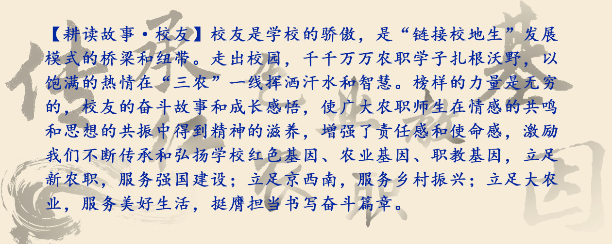 校友请看,学校坚持以红色基因为魂,以农业基因为根,以职教基因为本,砥砺征程,熠熠生辉!