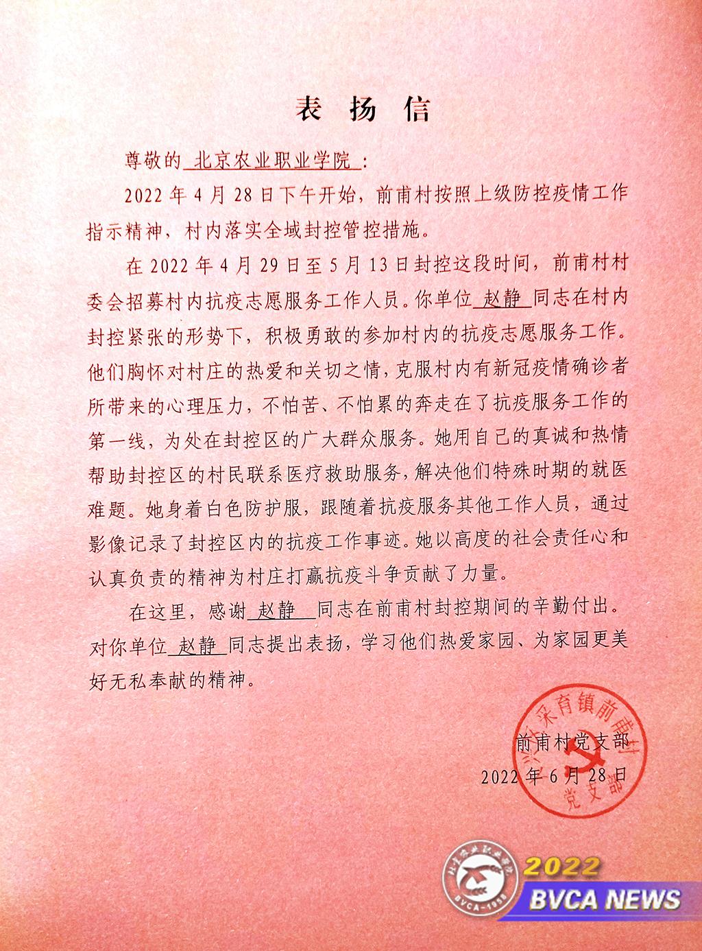 近日,学院收到来自大兴区采育镇前甫村党支部发来的表扬信,对我院村务管理专业20107班赵静同学积极响应村委号召,主动请缨,积极配合社区居委干部共同抗击疫情的事迹进行表扬。