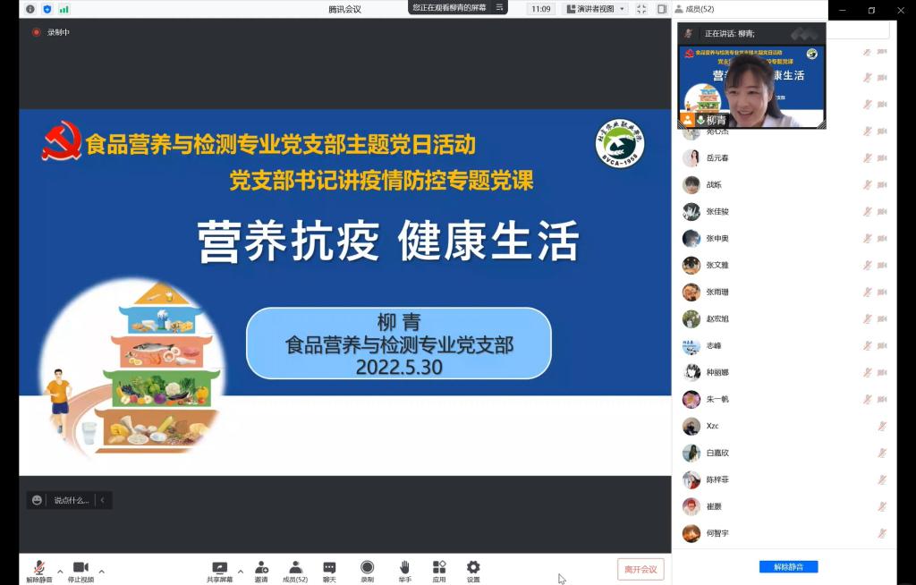 食品营养与检测专业党支部书记柳青副教授以“营养抗疫,健康生活”、“营养战’疫’,如何提高免疫力”为题,通过腾讯会议直播、beat365科普课堂线上实操等方式讲授精彩生动的系列党课。从“科学认识,发挥先锋模范作用”、“营养膳食,提高免疫力”、“自律自控,线上学习保质量”引导学生积极响应党的号召,科学认识疫情,增强传染病防控意识,坚定战胜疫情的信心,认真做好疫情防控各项工作。倡导学生增强健康自律意识,树立强健体魄、奋斗有我的决心。希望青年学生牢记习近平总书记的殷切期望,勇担新时代青春使命,用营养抗“疫”,真正成为德智体美劳全面发展的有为青年,做合格的社会主义接班人。