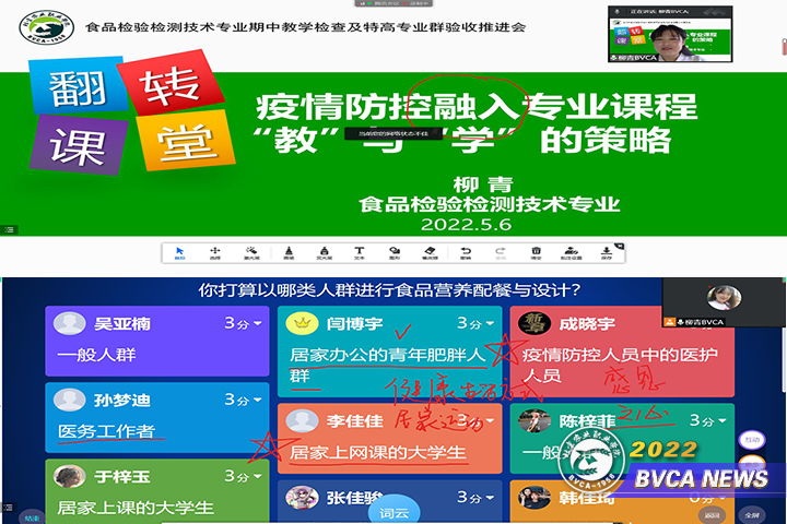疫情防控一线、教学一线就是战斗一线。食生系领导班子高度重视,统一部署,成立系部领导+专业主任+教学秘书+督导员组成的指导组,食品营养与检测专业党支部根据学院和系党总支部署,组建教授与骨干教师组成的先锋队,团队通力合作制定线上备课方案,对线上教学方案分解,精准施策,开展翻转课堂教学经验分享、“如何改进线上教学方法”、线上教学公开课等形式多样的主题党日活动,并就每日健康上报汇总、线上巡课、心理咨询等成立工作专班,全天候为疫情防控、线上教学保驾护航,保障在线教学期间各项工作平稳有序进行。