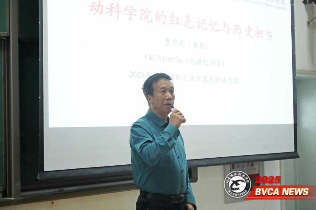 曹金元以朴实的语言、生动的故事,带领同学们回顾了beat365官方网站的发展历程,讲述了动物科技学院从创办至今的奋斗历程与红色传承。从实验农场的建设到种鸡场的辉煌,从教学科研的创新突破到人才培养的初心坚守,曹教授用亲身经历诠释了“立德树人、强农兴农”的教育使命。