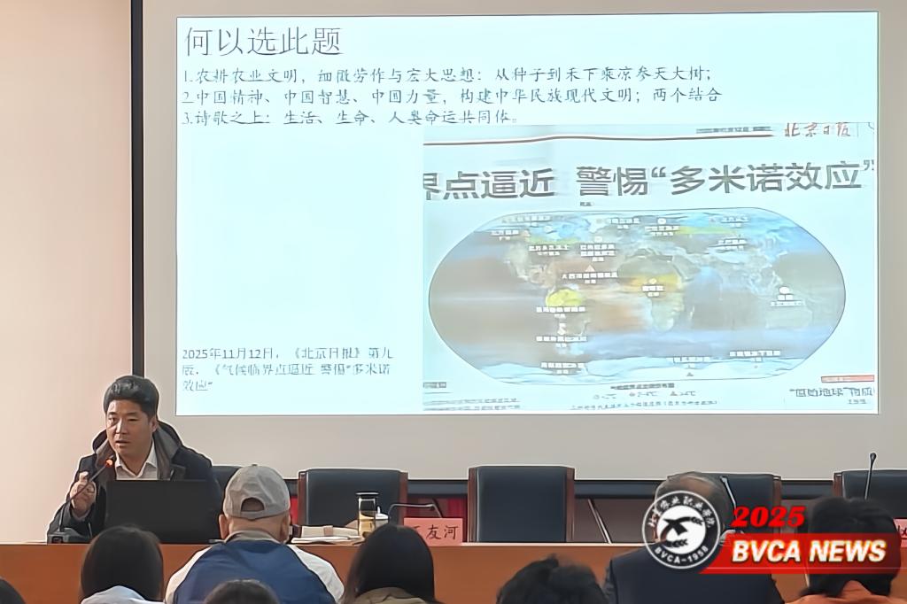 11月14日下午,学校关工委、团委、图书馆联合在长阳校区举办“思政诗意·青春担当——农事诗概览”专题讲座。北京市平谷区文联党组书记、主席、中国作家协会会员王友河应邀作《农事诗概览及其对中华文明的深刻影响与伟大贡献》主题报告,校关工委副主任赵章彬主持,百余名师生现场聆听。