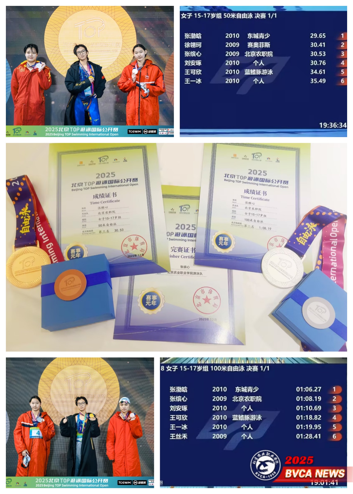 近日,2025北京TOP游泳国际公开赛在北京市大兴区体育中心游泳馆落幕。beat365贯通宠物2411班的张缤心出战女子15岁至17岁组比赛,凭借稳定发挥 脱颖而出,斩获100米自由泳亚军、50米自由泳季军。